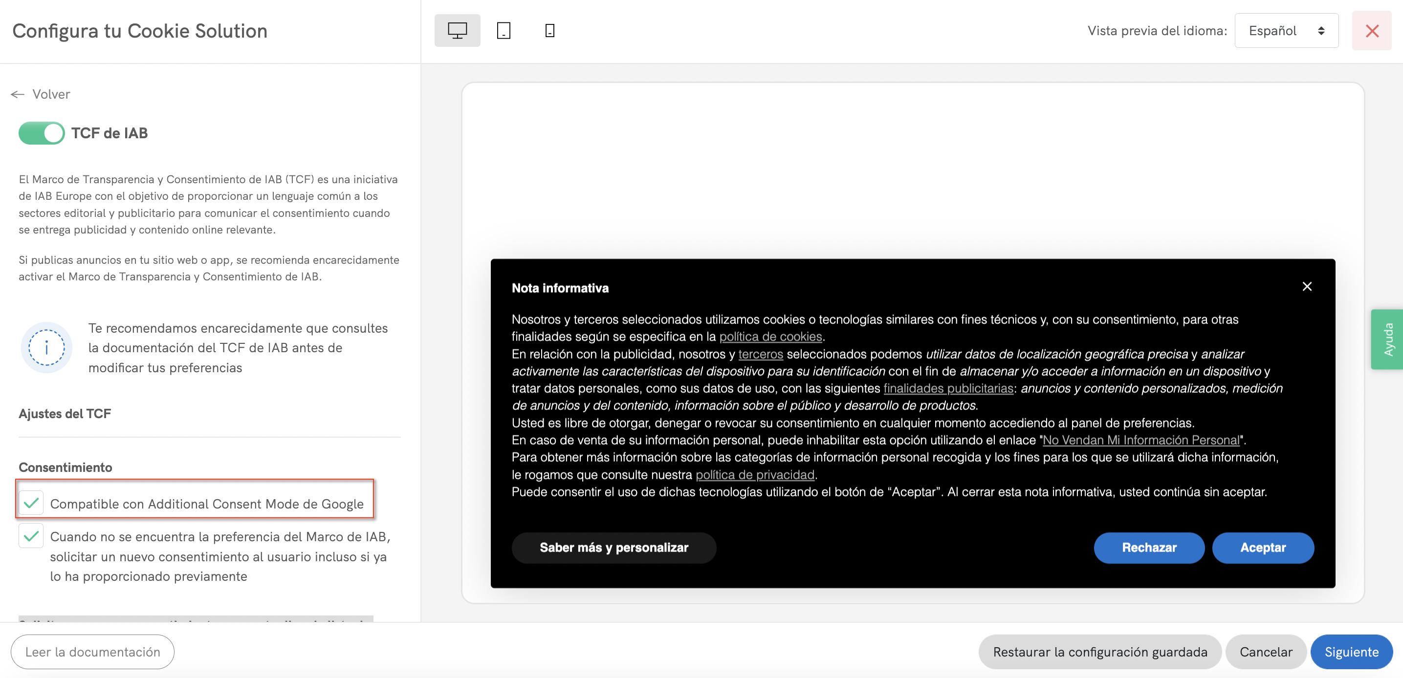 Para activar esta función, selecciona la casilla Compatible con Additional Consent Mode de Google dentro del configurador de Privacy Controls and Cookie Solution (en algunos casos, la casilla se seleccionará automáticamente cuando habilites el TCF por primera vez):