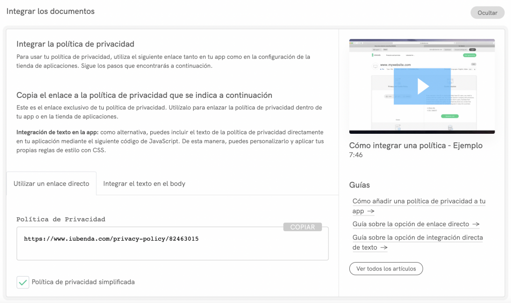 La opción de enlace directo es apropiada si no te importa que la política de privacidad no se muestre en tu web, sino que el enlace muestre la política en la página de iubenda.com. Esta opción es muy útil para tiendas de apps.