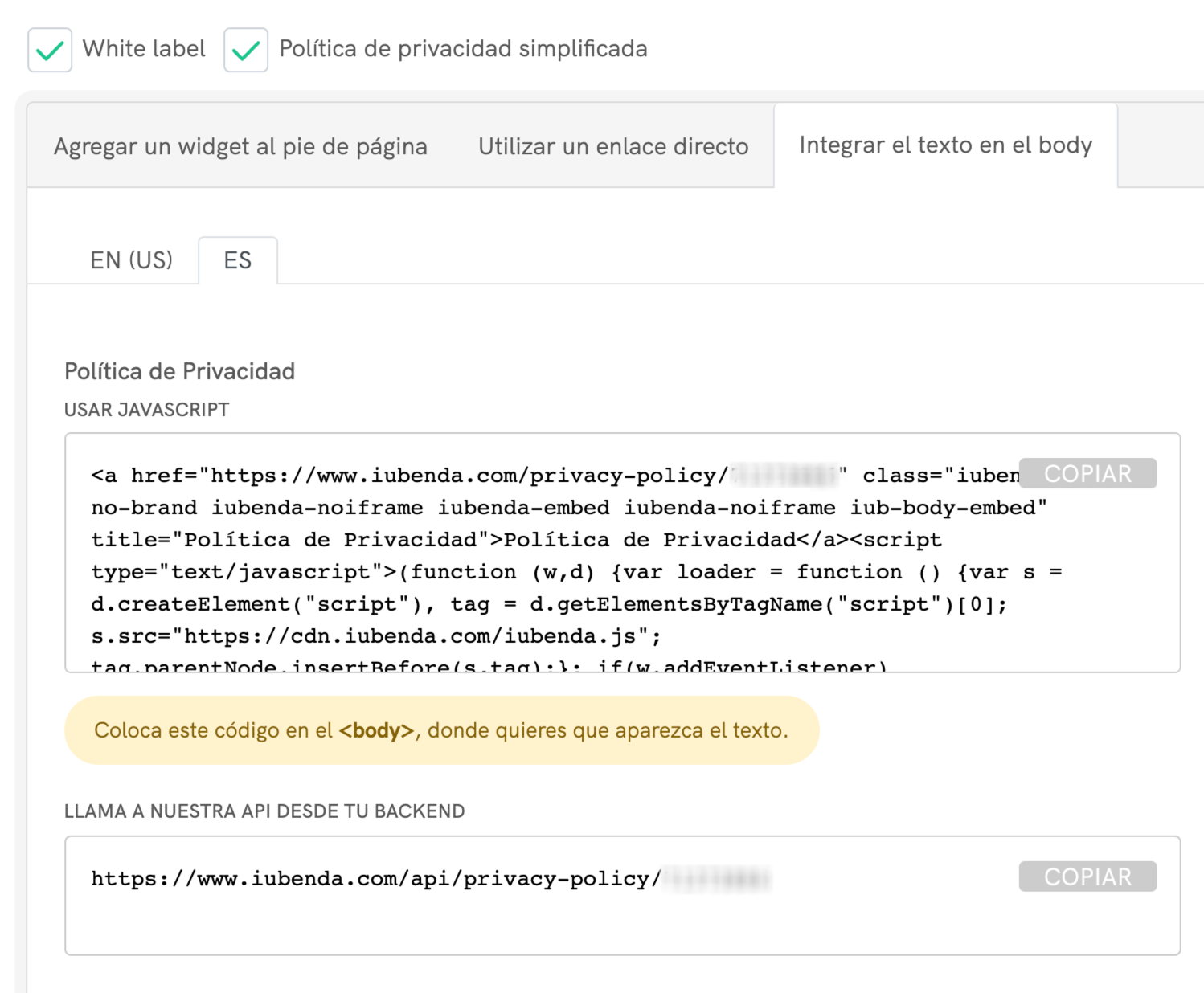 - Copia el código de iubenda de la pestaña “Integrar el texto en el body” (si aún no lo has hecho)