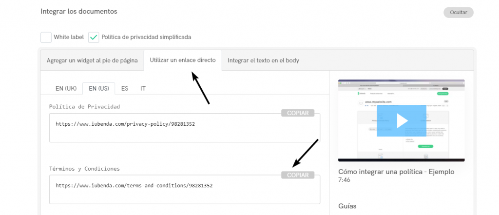 El Generador de Términos y Condiciones de iubenda ofrece tres opciones de integración, que pueden utilizarse con distintos fines: