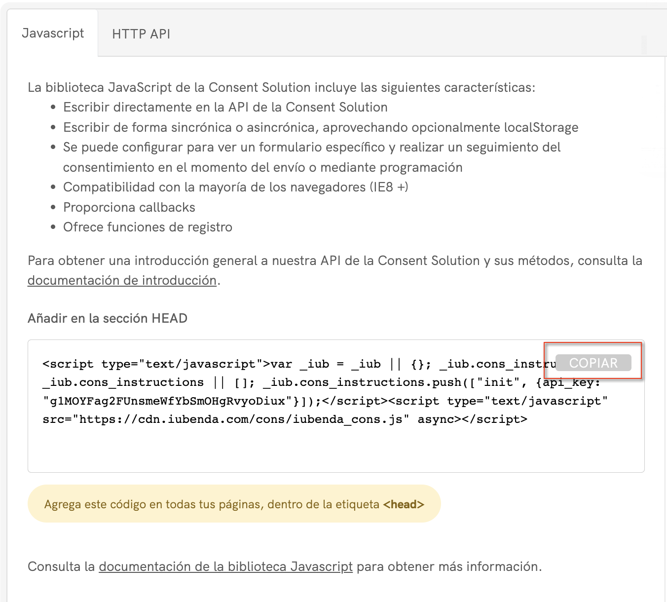 *La clave API es un código único que el SDK utiliza para comunicarse con el endpoint de nuestra API. Nosotros generamos tu clave API (que aparece como “YOUR_PUBLIC_API_KEY” en el ejemplo anterior) durante la activación de la Consent Database y es específica para ese sitio web en concreto.
