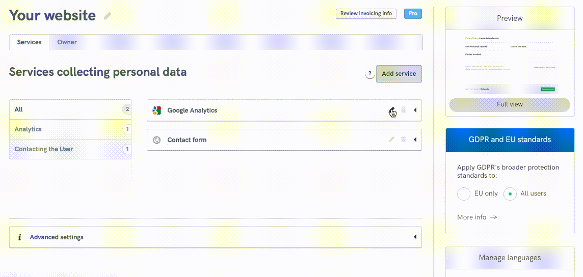 Accede a tu dashboard de iubenda y haz clic en el botón “Editar” de la política de privacidad correspondiente.