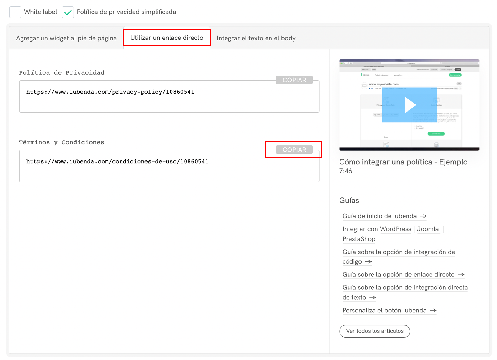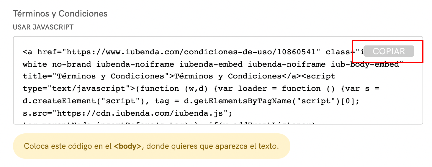 Selecciona Integrar el texto en el body, desplázate hacia abajo hasta Términos y Condiciones y haz clic en COPIAR.
