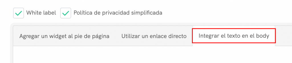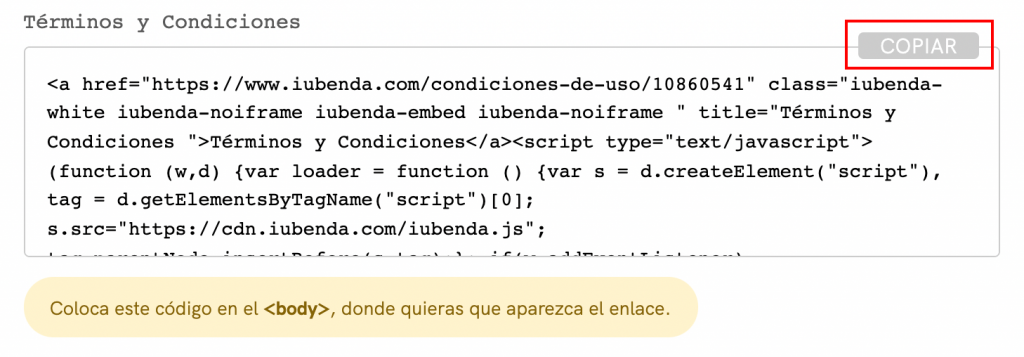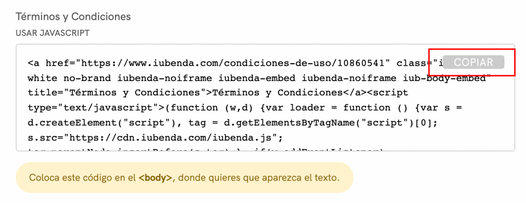 Primero, selecciona Integrar el texto en el body, desplázate hacia abajo hasta Términos y Condiciones y haz clic en COPIAR
