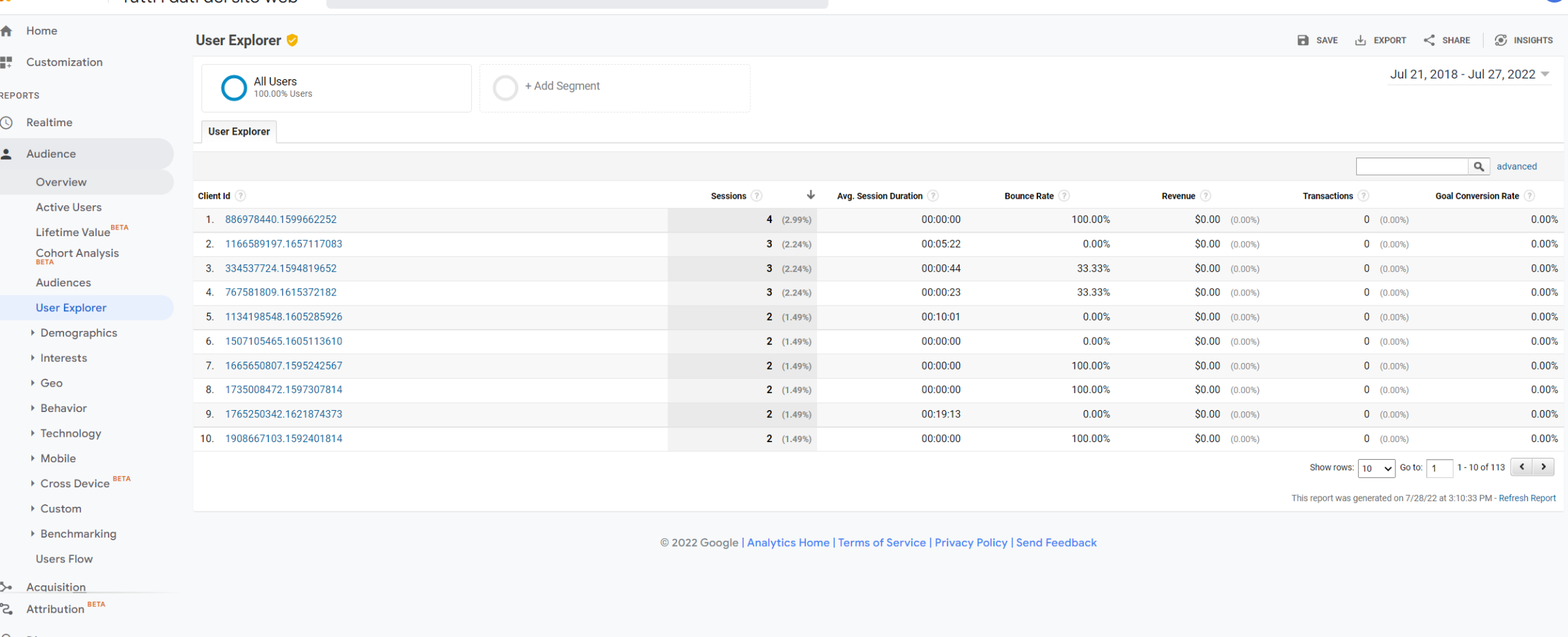 Depuis le menu, sélectionnez Audience puis User Explorer.