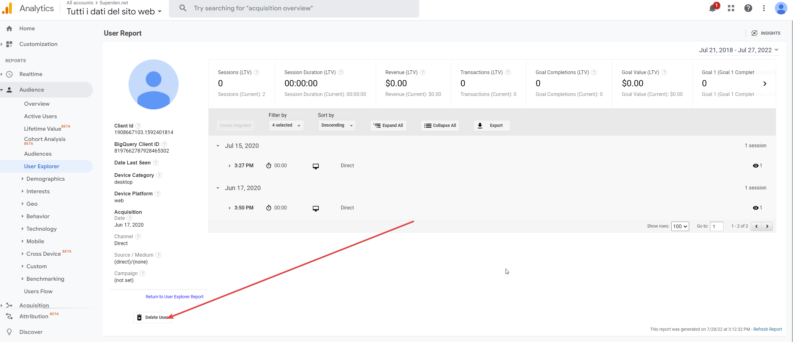 Cliquez sur l’ID client qui apparaît, et cliquez sur le bouton Supprimer l’utilisateur qui se trouve en bas de la page.