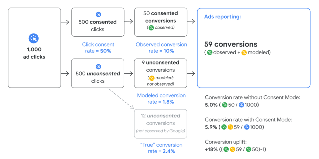 - Lorsque les cookies publicitaires sont rejetés, Google Consent Mode fournit toujours des informations utiles au niveau agrégé grâce aux conversions modélisées. La modélisation des conversions utilise l’apprentissage automatique et les parcours utilisateurs observables pour analyser les tendances et modéliser la relation entre le taux de conversion et le consentement des utilisateurs. Le tout, sans identifier les utilisateurs individuels.