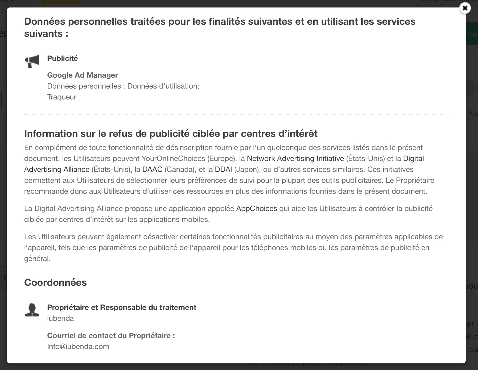 Si Google vous le demande, vous pouvez retrouver ce lien en affichant la version complète de votre politique de confidentialité, comme le montre l’image ci-dessous. Dans la section « Informations détaillées sur le traitement des Données personnelles », après la description du service de Google concerné, cliquez sur le lien « Google’s partner policy ».