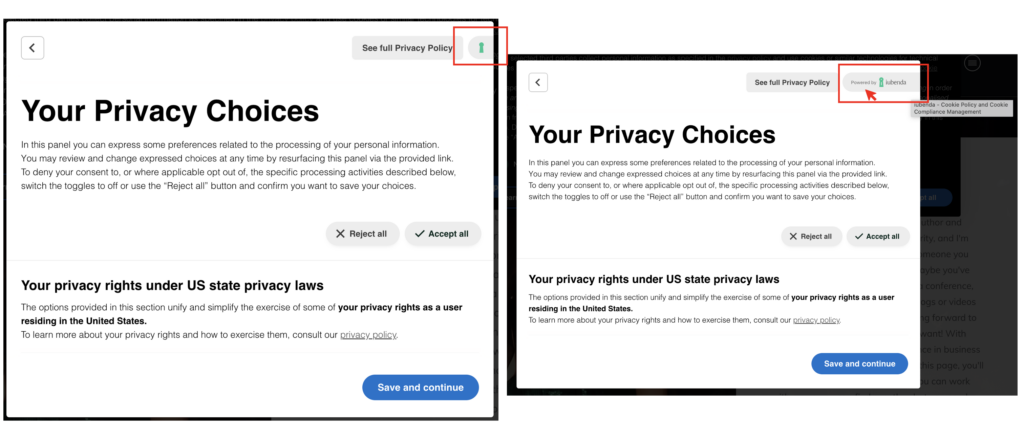 Cependant, il affichera notre logo vert en haut à droite de la deuxième couche ou du panneau de préférences (bouton “En savoir plus et personnaliser”). Lorsqu’elle est survolée, elle affiche “Powered by iubenda”, et lorsqu’elle est cliquée, elle conduit l’utilisateur à notre page d’accueil. Voir ci-dessous.