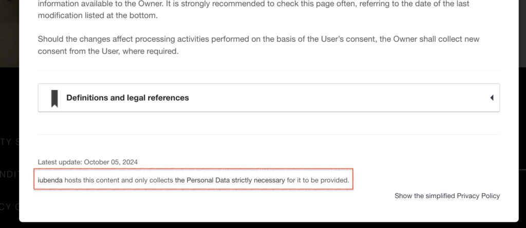 Un élément de marque subtil peut être trouvé au bas des documents et avis relatifs à la protection de la vie privée. Le mot “iubenda” renvoie à notre page d’accueil. Il se présente comme suit :