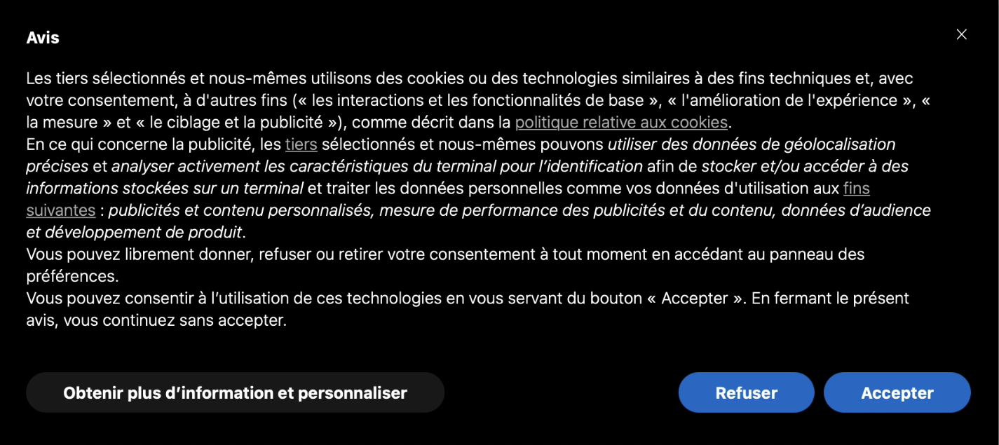 Pour respecter les critères de l’IAB applicables à la version 2, nous avons complété le texte du bandeau cookies qui est désormais beaucoup plus long. Nous y avons ajouté des informations essentielles relatives aux options améliorées que nous vous présenterons dans les sections suivantes.