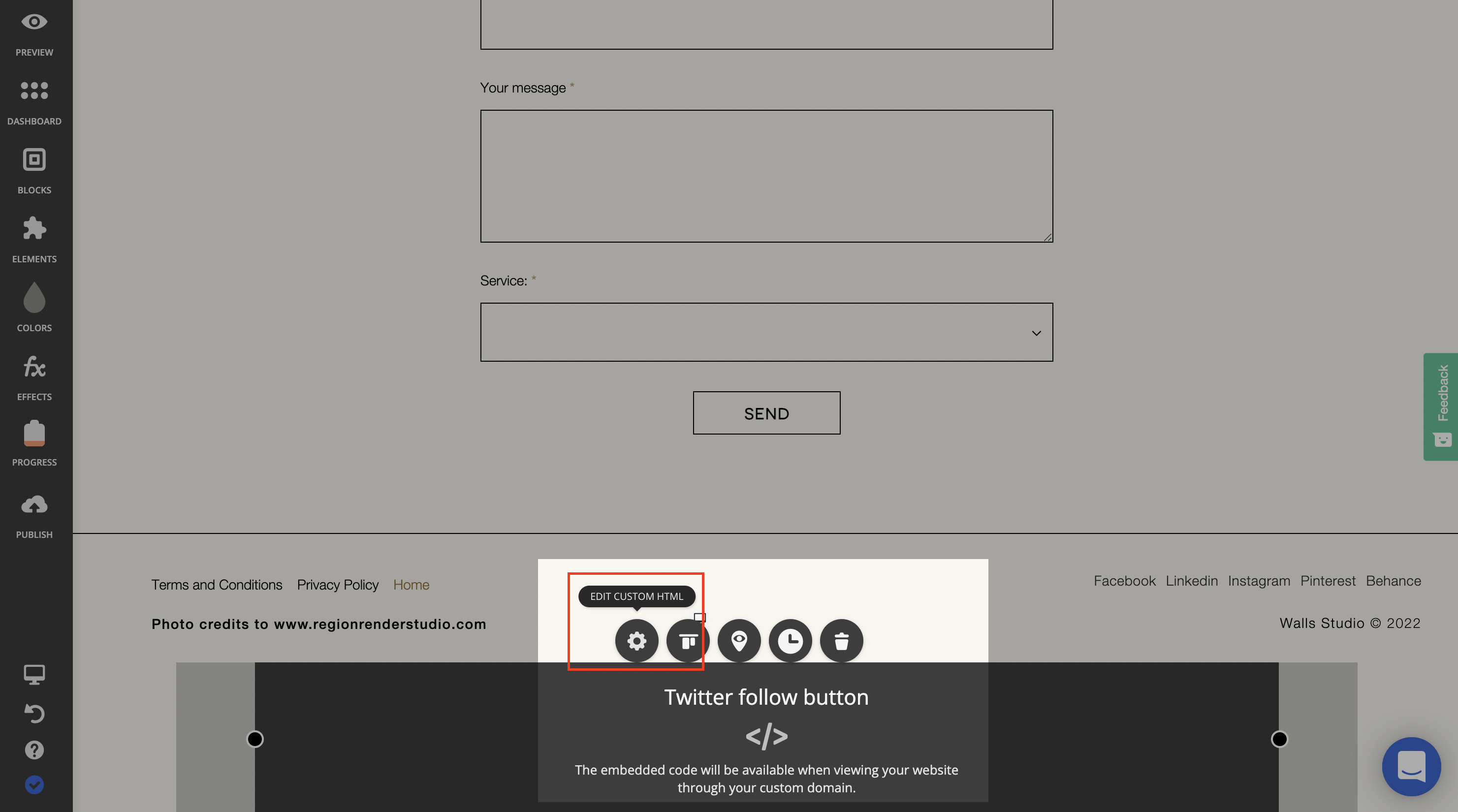 Dans l’éditeur de site Ucraft, cherchez le script à modifier (il vous suffit de rechercher le service à bloquer, dans ce cas, le bouton “Follow” Twitter)