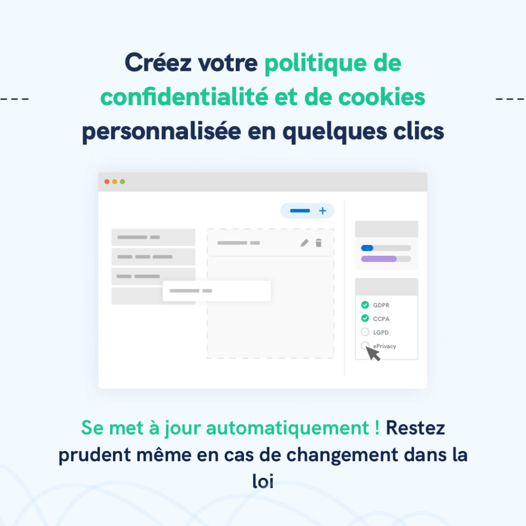Excellent choix ! Le Générateur de Politique de Confidentialité et de Cookies est notre produit phare. En effet, les politiques de confidentialité sont requises presque partout dans le monde et sont essentielles pour la conformité au RGPD, CCPA, LGPD et autres.