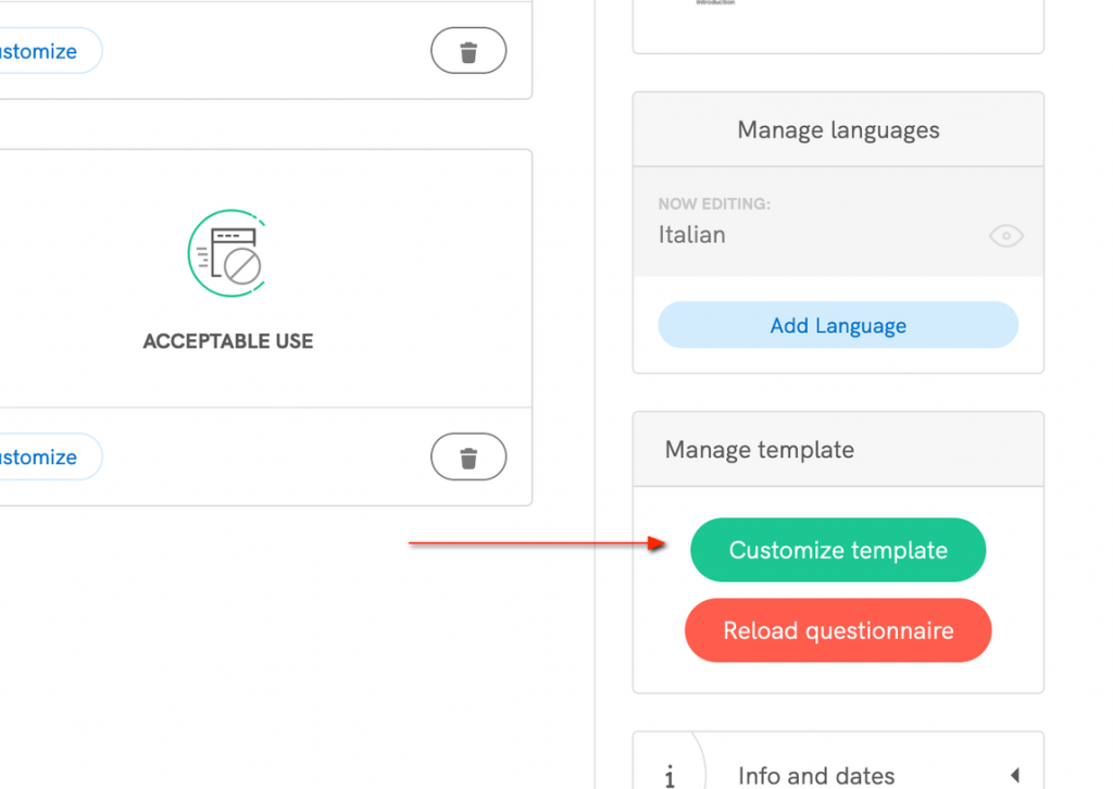You’ll need an iubenda support person to unlock this feature for you. When your T&C document is unlocked, you’ll need to go into your T&C admin area where you’d usually add/choose clauses. There you’ll notice that the sidebar now has a “Customize template” button.