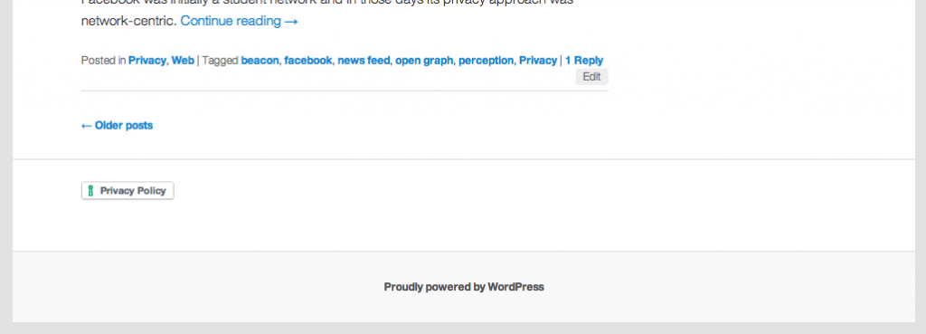 The WordPress privacy page is only automatically linked to via your site’s registration and login pages. Since most privacy laws (including the GDPR) require that your privacy policy be easily accessible throughout your entire website, you’ll need to manually link to your privacy page via your main menu, footer menu, or, via an integration method such as the footer widget method directly below.