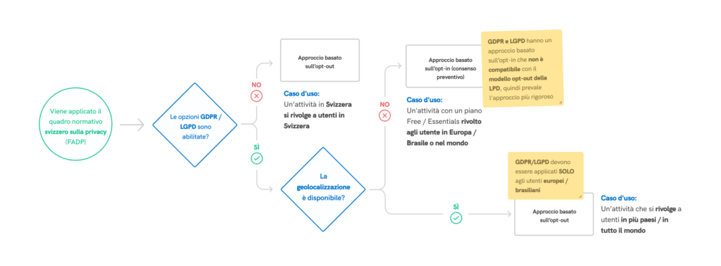 Nota: se non devi rispettare per forza una legislazione diversa dalla LPD (ossia tu e i tuoi utenti vi trovate tutti in Svizzera), ma preferisci comunque applicare un approccio all’uso di cookie e tecnologie simili basato sul consenso preventivo, la nostra soluzione ti offre questa possibilità, che tra l’altro sarebbe l’opzione preferita dall’Autorità svizzera per la protezione dei dati.