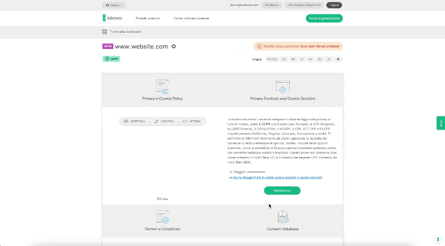 • accedi alla sezione di modifica della privacy policy, disponibile dalla Dashboard, cliccando sulla tua policy e su “Modifica” nella relativa sezione;