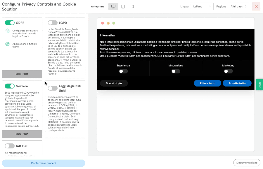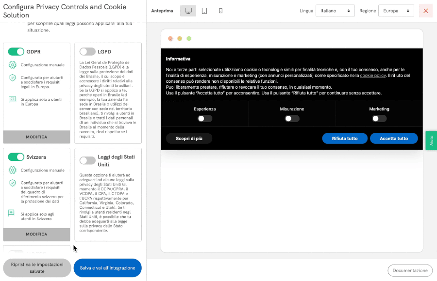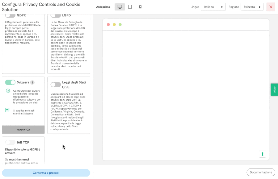 All’interno del Generatore di Privacy Controls and Cookie Solution, abilita l’opzione “Svizzera”.