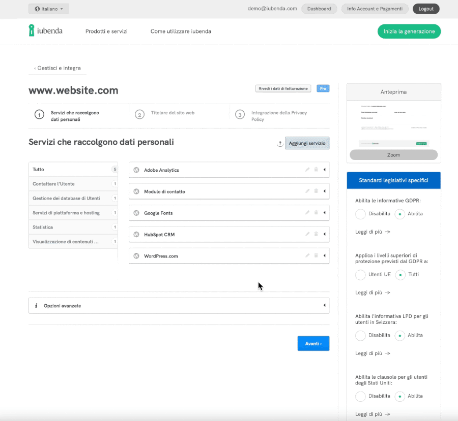 💡 Abbiamo aggiunto un site scanner all’interno della finestra del servizio del generatore, così potrai scansionare rapidamente il tuo sito in tempo reale per identificare quali servizi vanno aggiunti alla tua policy.