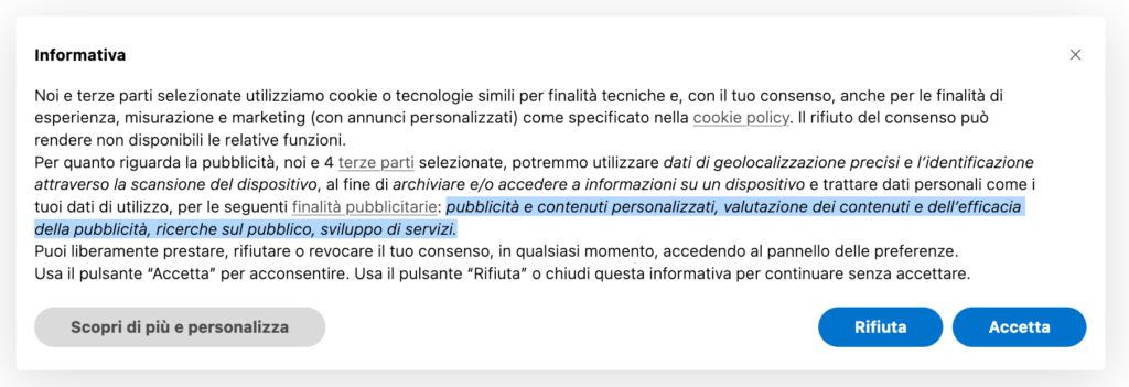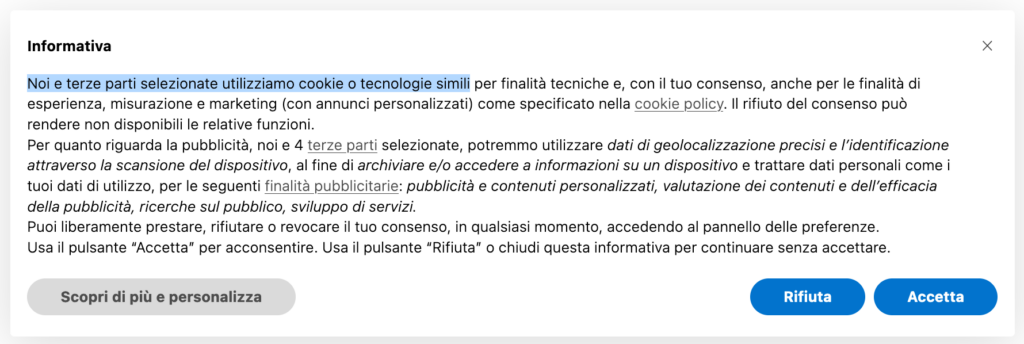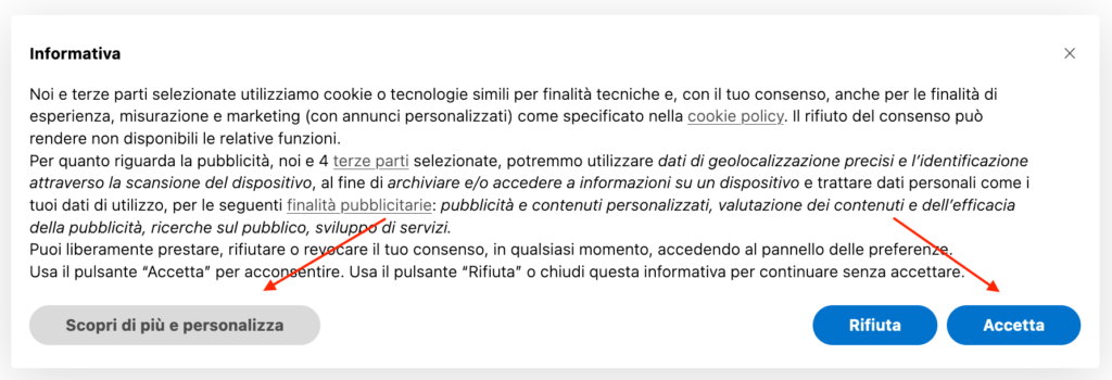 • Una call to action per prestare il consenso (es. “Accetto”, “Ok”, “Approvo”, etc.) e una per permettere all’utente di personalizzare le proprie scelte (es. “Impostazioni avanzate”, “Personalizza”, etc.)