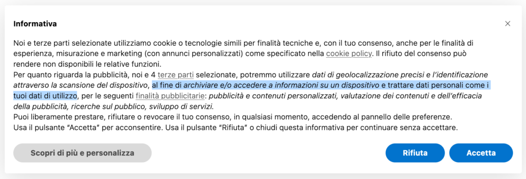 • Informazioni riguardanti il fatto che determinate informazioni siano archiviate e/o accessibili sul dispositivo dell’utente (es. utilizzo di cookie, identificatori o altri dati relativi al dispositivo)