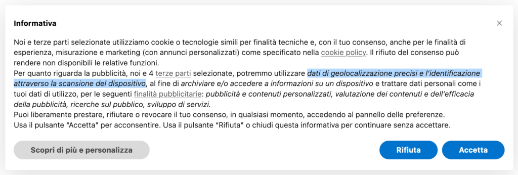 In base alle Politiche TCF v 2.2 il primo pannello dell’interfaccia utente (ossia il Banner) DEVE necessariamente includere i seguenti elementi: