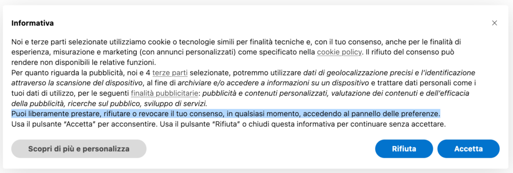• Informazioni riguardanti il fatto che l’utente è libero di revocare il proprio consenso in qualsiasi momento e le istruzioni da seguire per poter esercitare tale diritto e navigare nuovamente l’interfaccia a tale scopo