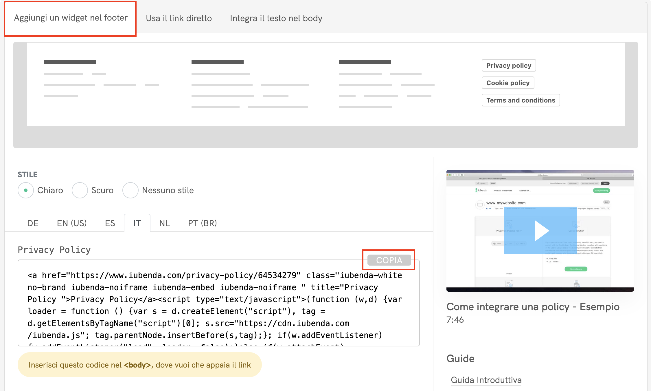 Il passaggio finale è aggiugere il documento che hai appena creato al tuo sito web. Se hai scelto il piano gratuito, hai una solo opzione di integrazione disponibile, l’integrazione nel footer del sito.
