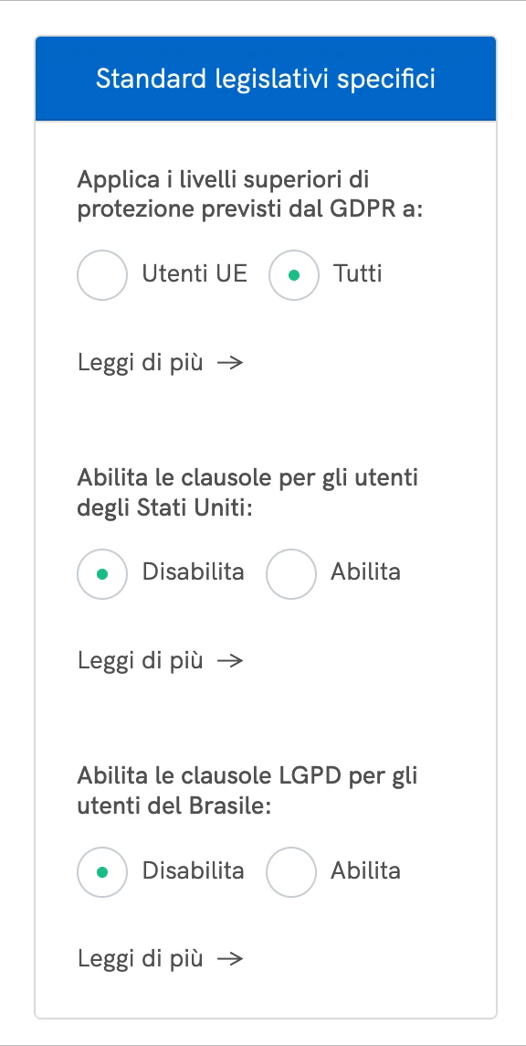 Puoi generare la tua privacy policy per gli Stati Uniti o aggiornare quella che hai già selezionando “Abilita le clausole per gli utenti degli Stati Uniti” per attivare le nuove clausole specifiche.