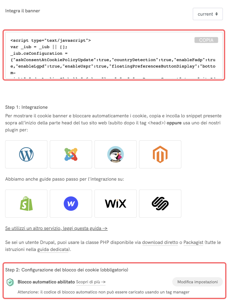 ⚠️ Una volta cliccato su “Salva modifiche“, tornerai alla sezione per l’integrazione, dove potrai verificare l’attivazione del “Blocco preventivo dei cookie“. Da qui, potrai copiare e incollare facilmente lo snippet del codice all’inizio del tag <head> delle tue pagine.