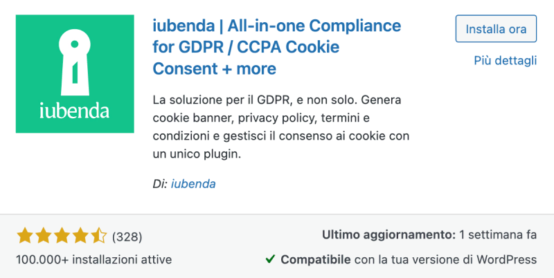 Più di un semplice cookie banner. Il plugin WordPress di iubenda è una soluzione di conformità completa, semplice da utilizzare, con testi redatti da avvocati, che scansiona e configura automaticamente il tuo sito in base alle tue esigenze specifiche.