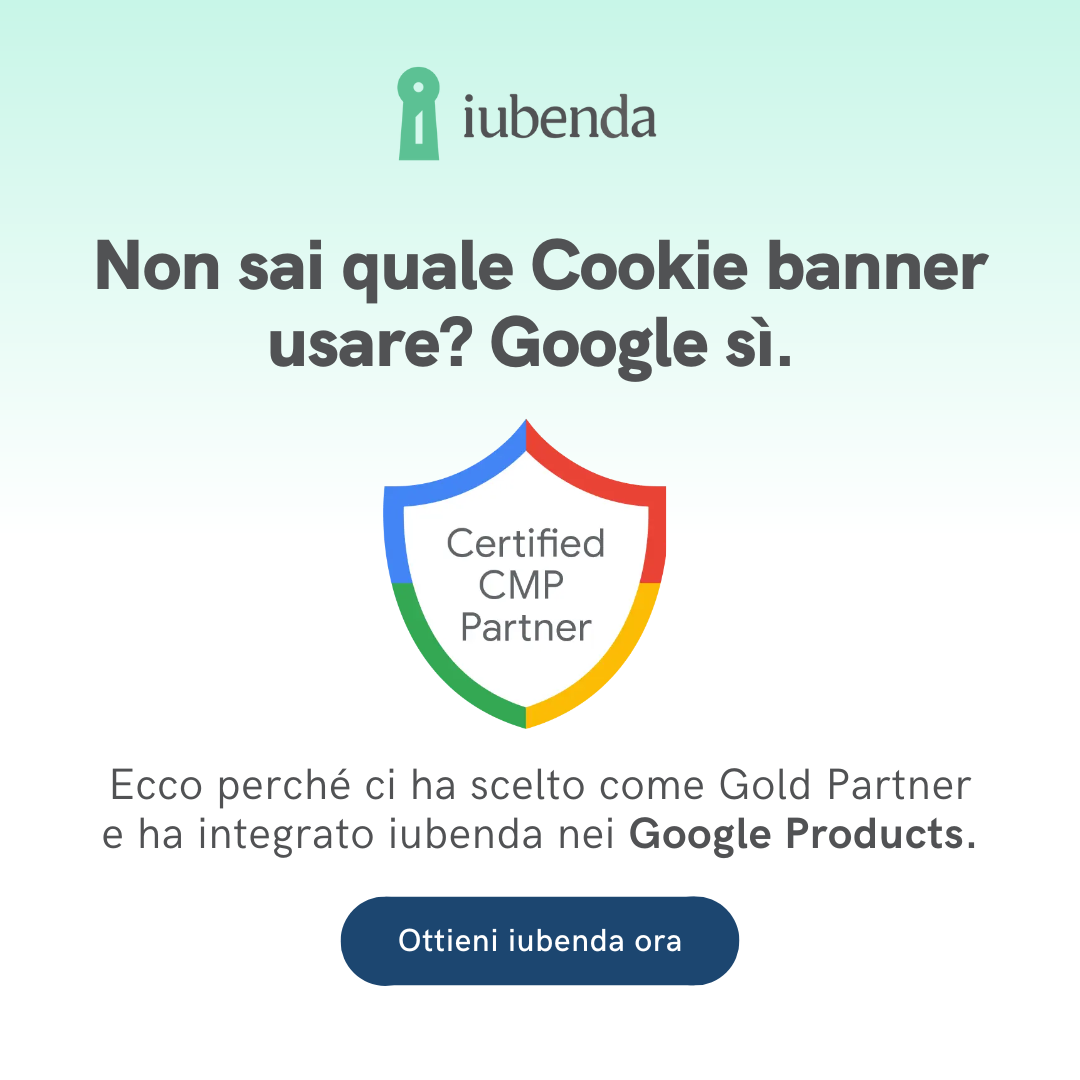 🏅 iubenda è CMP Gold Partner di Google!Hai bisogno di aiuto con la compliance? Scegli una CMP che soddisfa tutti gli standard. Usa il mio link [aggiungi il tuo link di affiliazione qui] per un 10% di sconto.