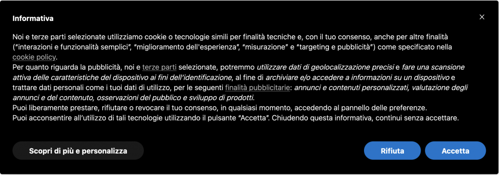 Il testo del cookie banner è stato esteso per poter soddisfare i requisiti dello IAB. Il testo aggiuntivo contiene informazioni relative alle opzioni avanzate descritte più in basso.