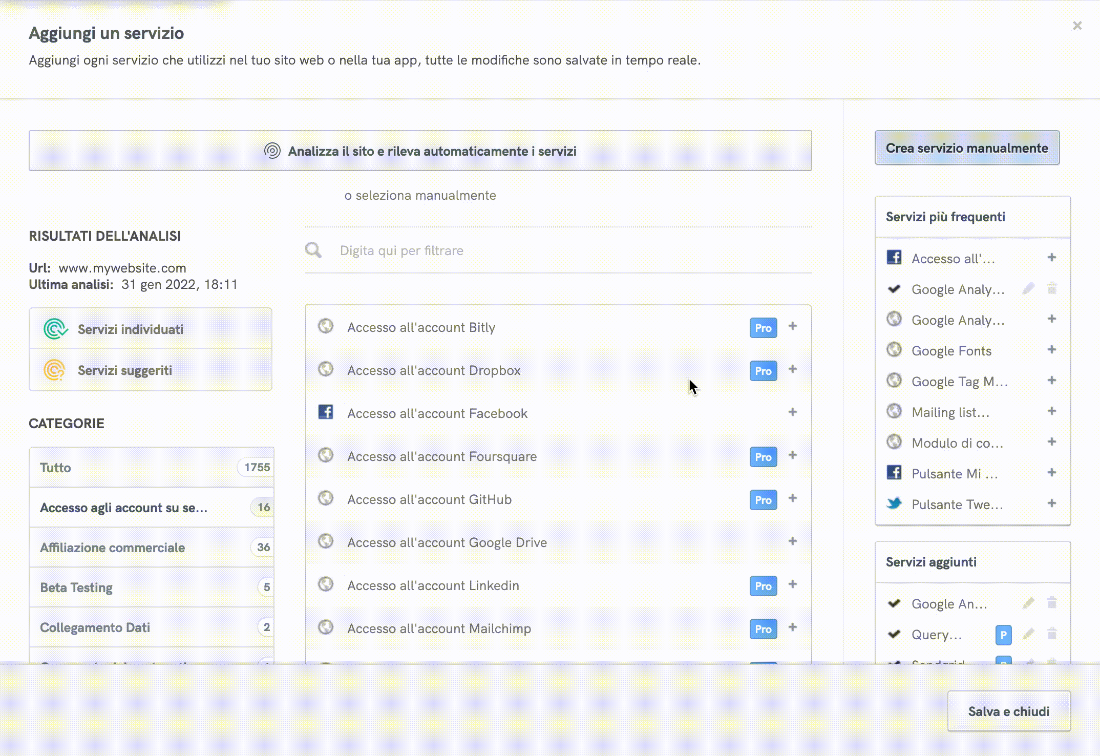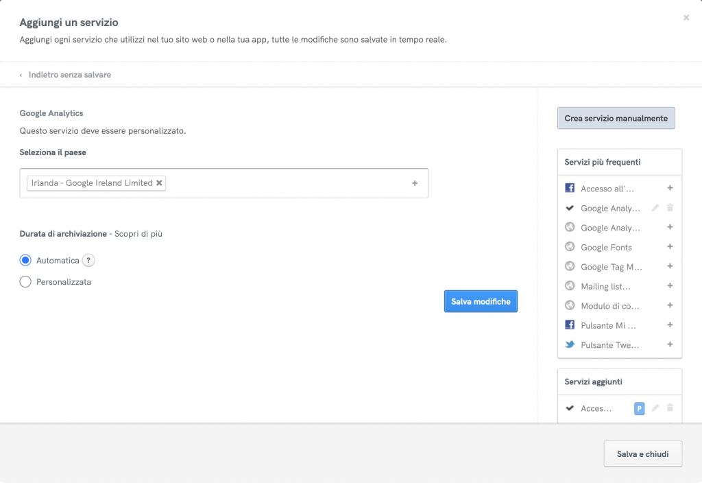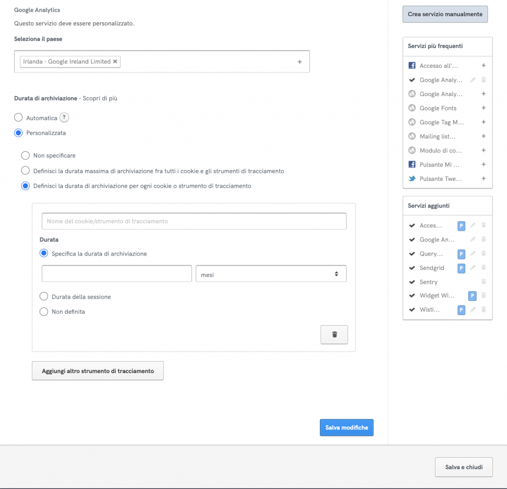 Se il servizio non richiede alcuna personalizzazione (tipologie di dati personali raccolti, paese, e così via), quando lo aggiungi il generatore utilizzerà automaticamente l’impostazione “Automatica”. Se vuoi personalizzare la durata dei cookie e degli strumenti di tracciamento, puoi cliccare sul pulsante di personalizzazione in corrispondenza del servizio aggiunto.