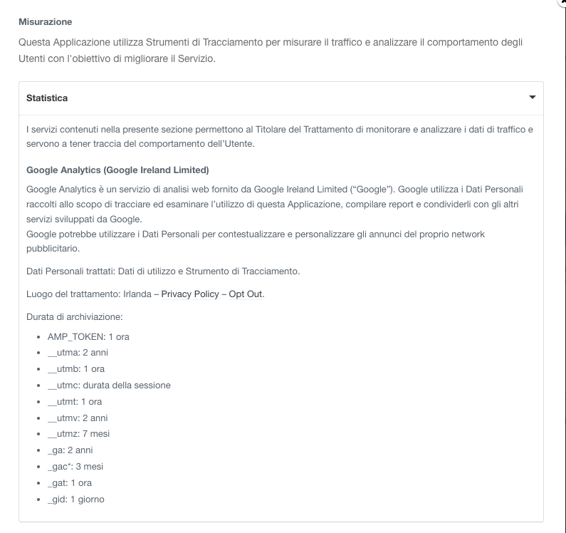 Il risultato? La tua Cookie Policy generata con iubenda mostrerà la durata dei cookie dei vari servizi in uso nel tuo sito/app.