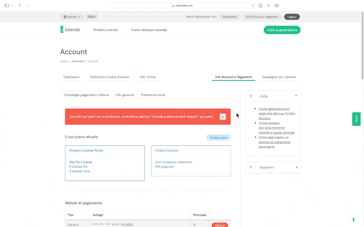 - Poi clicca sul tasto “Info Account e Pagamento” nel menù a tendina in alto a destra per accedere alla pagina del tuo account iubenda.
