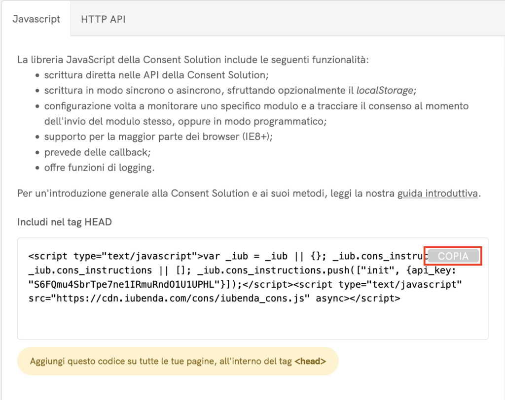 Copia il tuo codice, come mostrato nell’immagine qui sotto, usando la sezione JavaScript e cliccando sul tasto COPIA.