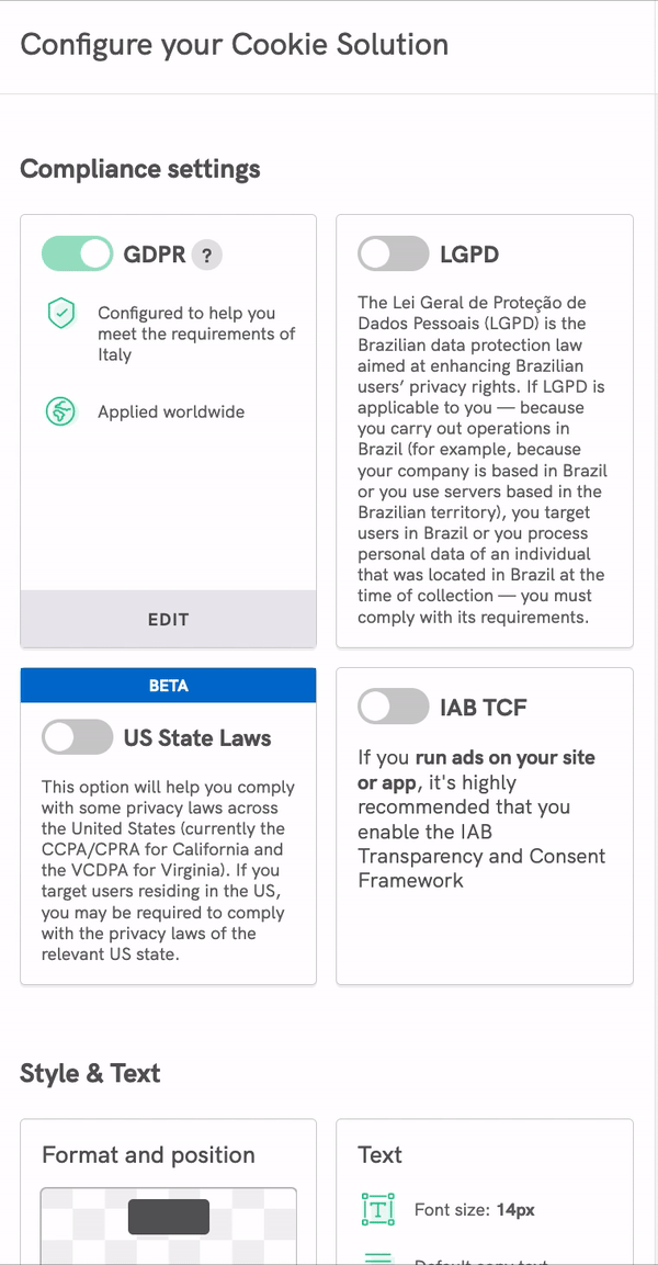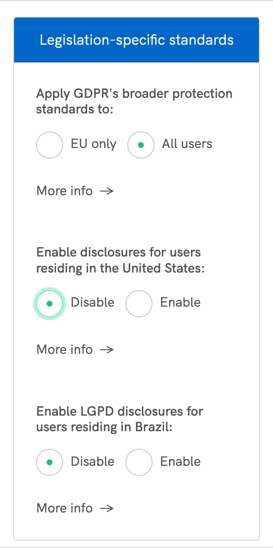 Juridisch correcte oplossingen om je websites en apps in overeenstemming te brengen met de wetgeving in meerdere landen en rechtsgebieden.