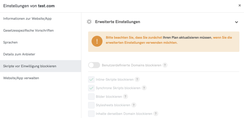 - Inline-Skripte blockieren: Wenn diese Option aktiviert ist, werden Skripte, die direkt in das HTML Ihrer Website integriert sind, vor der Einwilligung blockiert.