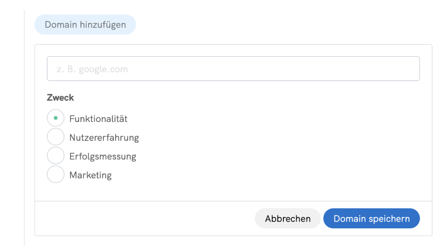 Aktivieren Sie dazu den Schalter “Benutzerdefinierte Domains blockieren” und wählen Sie “Domain hinzufügen”. An dieser Stelle können Sie die Domain angeben und den Zweck nennen. Klicken Sie abschließend auf “Domain speichern”, um alle Anfragen zu blockieren, bis die Einwilligung für den angegebenen Zweck erteilt wurde.