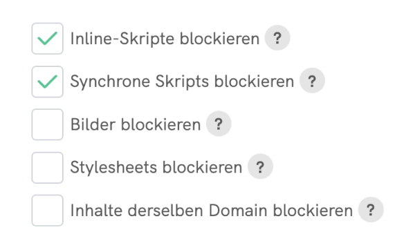 - Inhalte derselben Domain blockieren: Wenn diese Option aktiviert ist, werden Inhalte von Ihrer eigenen Domain auf Ihrer Website blockiert. Dazu gehören Skripte, Bilder, Stylesheets und andere Ressourcen, die von Ihrer eigenen Domain stammen. Seien Sie bitte vorsichtig, wenn Sie diese Option aktivieren, da dies die Funktionalität und das Aussehen Ihrer Website beeinträchtigen kann.