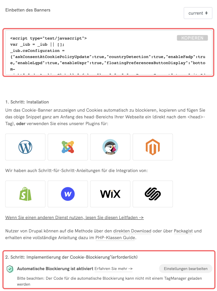 ⚠️ Sobald Sie auf “Änderungen speichern” klicken, werden Sie zum Bereich “Einbetten” weitergeleitet, wo Sie die Aktivierung von “Vorherige Blockierung von Cookies” überprüfen können. Von dort aus können Sie den Codeschnipsel ganz einfach am Anfang des <head>