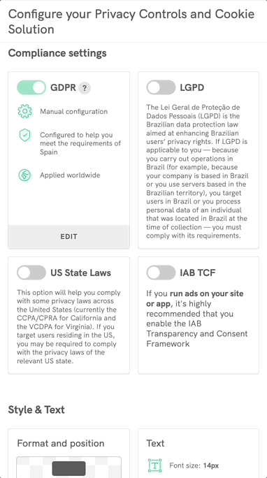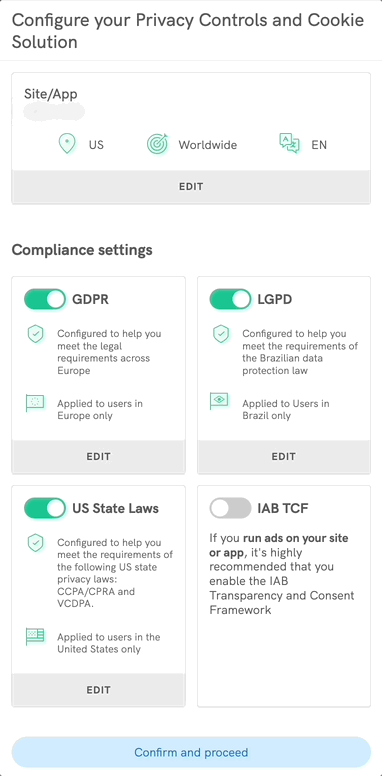 👉 Wählen Sie einfach während der Konfiguration der Privacy Controls und Cookie Solution die Regionen aus, in denen Sie ansässig sind, und unsere Lösung übernimmt den Rest für Sie!