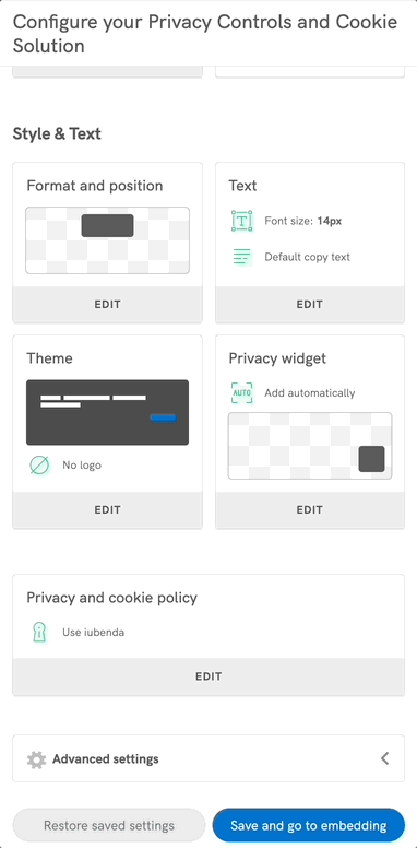 - Klicken Sie im Abschnitt Stil & Text auf der Kachel Datenschutz-Widget auf Bearbeiten und wählen Sie dann einfach aus, ob Sie das Widget automatisch hinzufügen oder den Link zum Hinweis bei Erhebung manuell einbetten möchten.