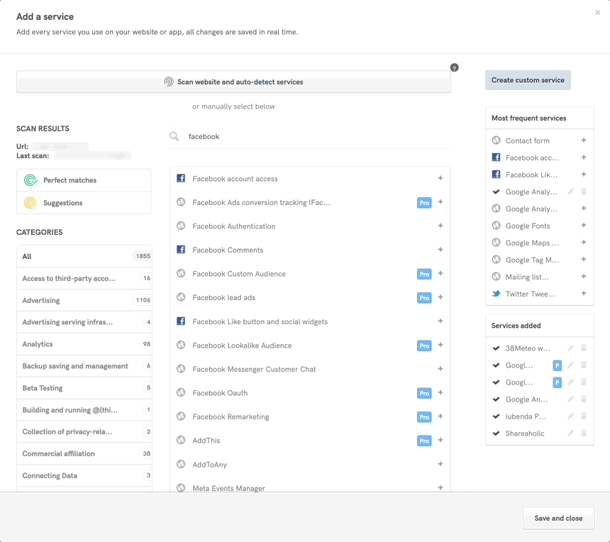 Für benutzerdefinierte Dienste (d. h. über „Eigenen Dienst erstellen“ hinzugefügte Dienste) werden alle Kontrollkästchen als nicht ausgewählt angezeigt und Ihnen die entsprechende Wahl überlassen.