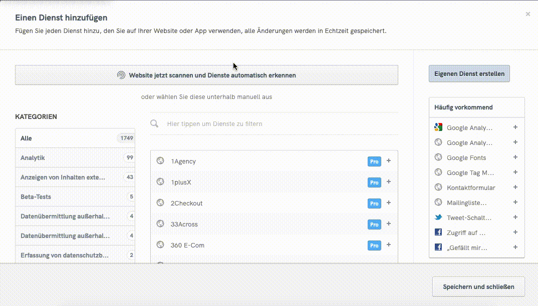 Wenn der hinzugefügte Dienst keine Anpassungen erfordert (d.h. die Art der erfassten personenbezogenen Daten, die Region usw.), verwendet der Generator beim Hinzufügen des Dienstes automatisch die Einstellung “Automatisch”. Wenn Sie die Lebensdauer von Cookies und Trackern anpassen möchten, können Sie auf den Anpassungsbutton innerhalb des entsprechenden Dienstes klicken.