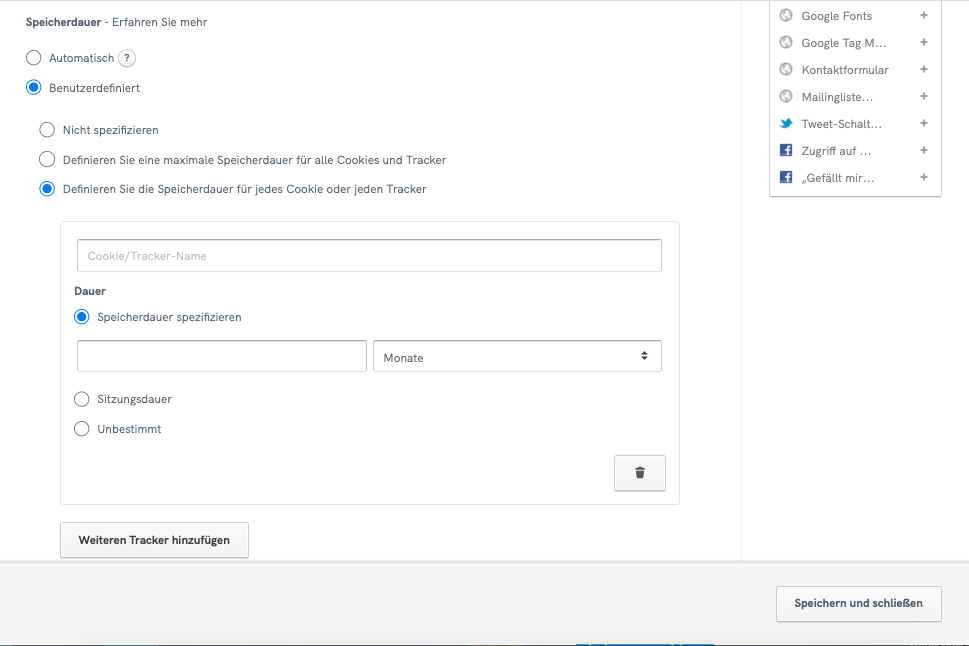 Wenn Sie technische Cookies von Erstanbietern verwenden, können Sie entweder eine allgemeine maximale Lebensdauer oder für jedes einzelne Cookie/Tracker eine Lebensdauer in Stunden, Tagen, Monaten oder Jahren angeben.