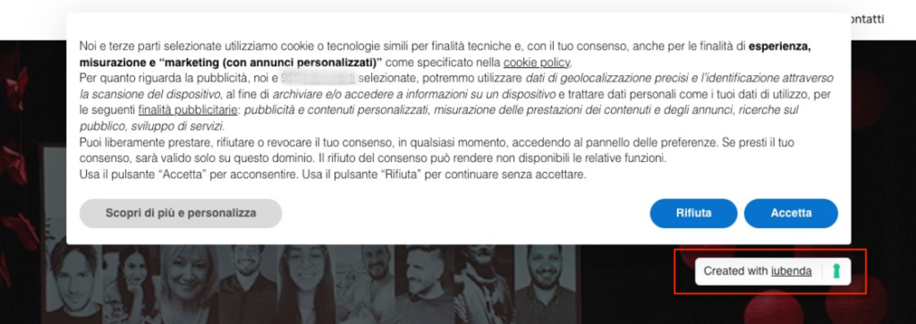 Bitte beachten Sie, dass bei den Plänen Free und Starter die Produkte mit dem vollen iubenda Branding versehen sind. Bei dieser Option bleibt eine anklickbare “created by iubenda” Schaltfläche unten rechts in Datenschutzdokumenten, Hinweisen und Modals sichtbar, wie unten in einem Beispiel unter einem Cookie-Banner zu sehen ist: