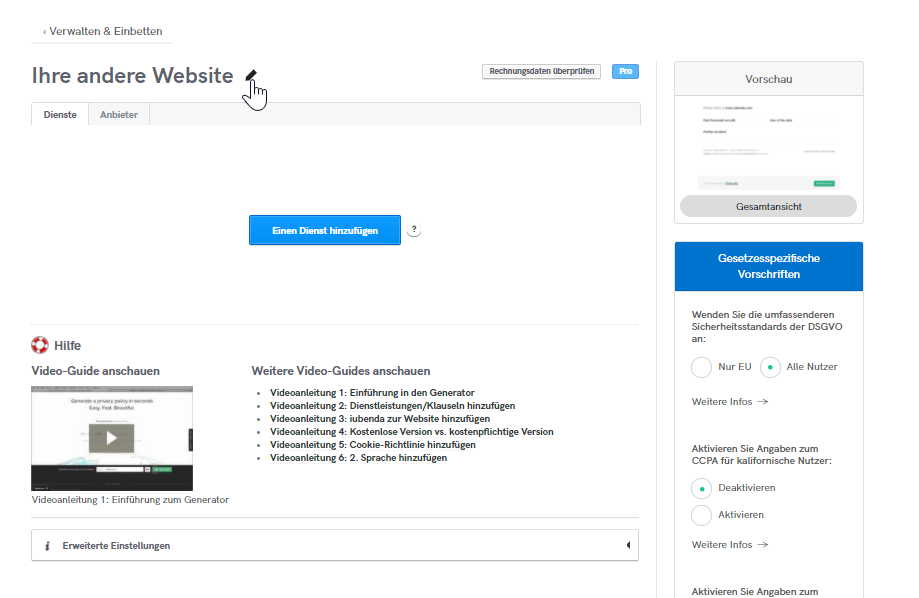 Alternativ können Sie diese auch im Editor für Dokumente aktualisieren (klicken Sie unter Datenschutz- und Cookie-Richtlinie auf Bearbeiten), klicken Sie dann auf den kleinen grauen Stift rechts neben dem URL/App-Titel der Website und bearbeiten Sie diesen nach Bedarf: