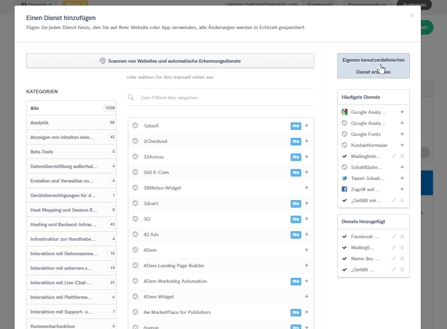 • Wenn Sie Twitter oder andere Auth-Dienste (=OAuth) für die Benutzerverwaltung verwenden, dann fügen Sie den entsprechenden Dienst hinzu , indem Sie auf „Dienst hinzufügen“ klicken und geben anschließend den Namen des Dienstes ein, den Sie hinzufügen möchten. Denken Sie daran, alle Dienste aufzunehmen, die persönliche Informationen verarbeiten. Wenn Sie die Benutzerregistrierung selbst vornehmen, vergessen Sie nicht, den Dienst „Direkte Registrierung“ hinzuzufügen.